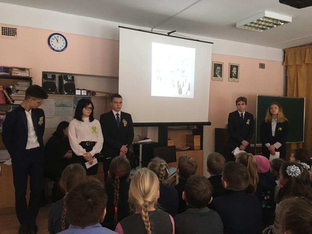 Восьмиклассники под руководством учителя истории Келеш С.А. подготовили лекторий для учащихся школы. Они рассказали учащимся начальной школы и 5-6-классникам  о предметах, которые являлись символами блокадного города.
