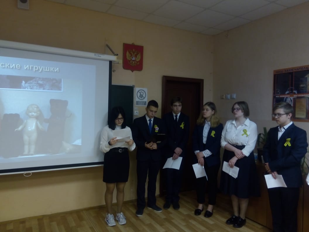 Учащимся 7-8 классов был показан фильм об одном дне из жизни блокадного Ленинграда, после просмотра которого каждый ученик ответил на вопросы анкеты. Ученики 9 и 11 класса познакомились с фильмом о Холокосте, подискутировали, подумали, а знают ли они что такое Холокост?