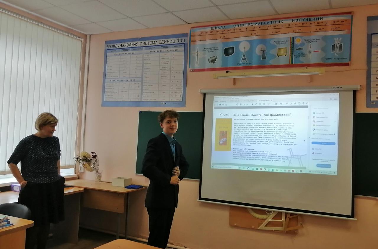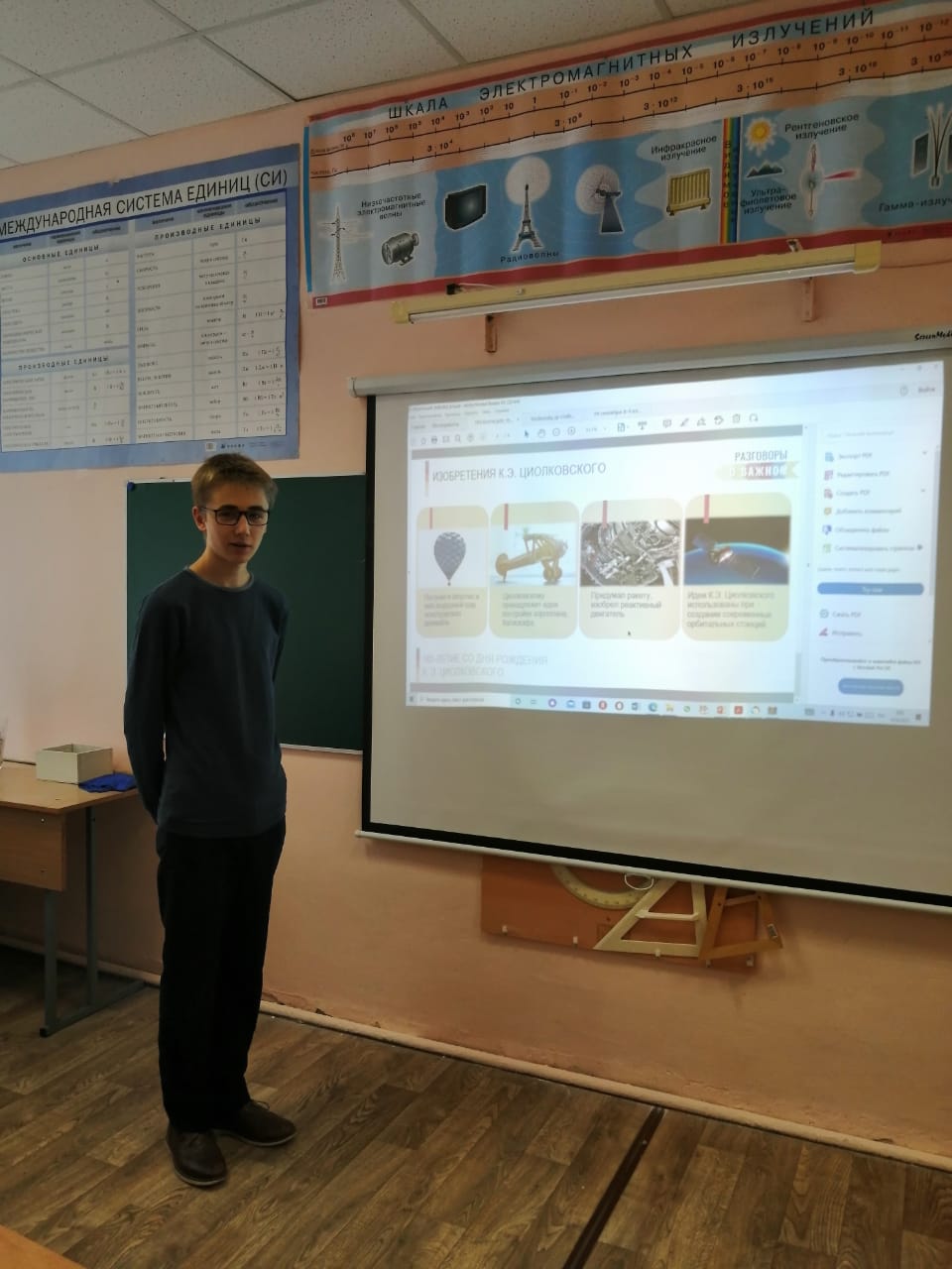 Ребята посмотрели информационный ролик о Константине Эдуардовиче и вместе с классными руководителями порассуждали о подвигах людей во имя науки.