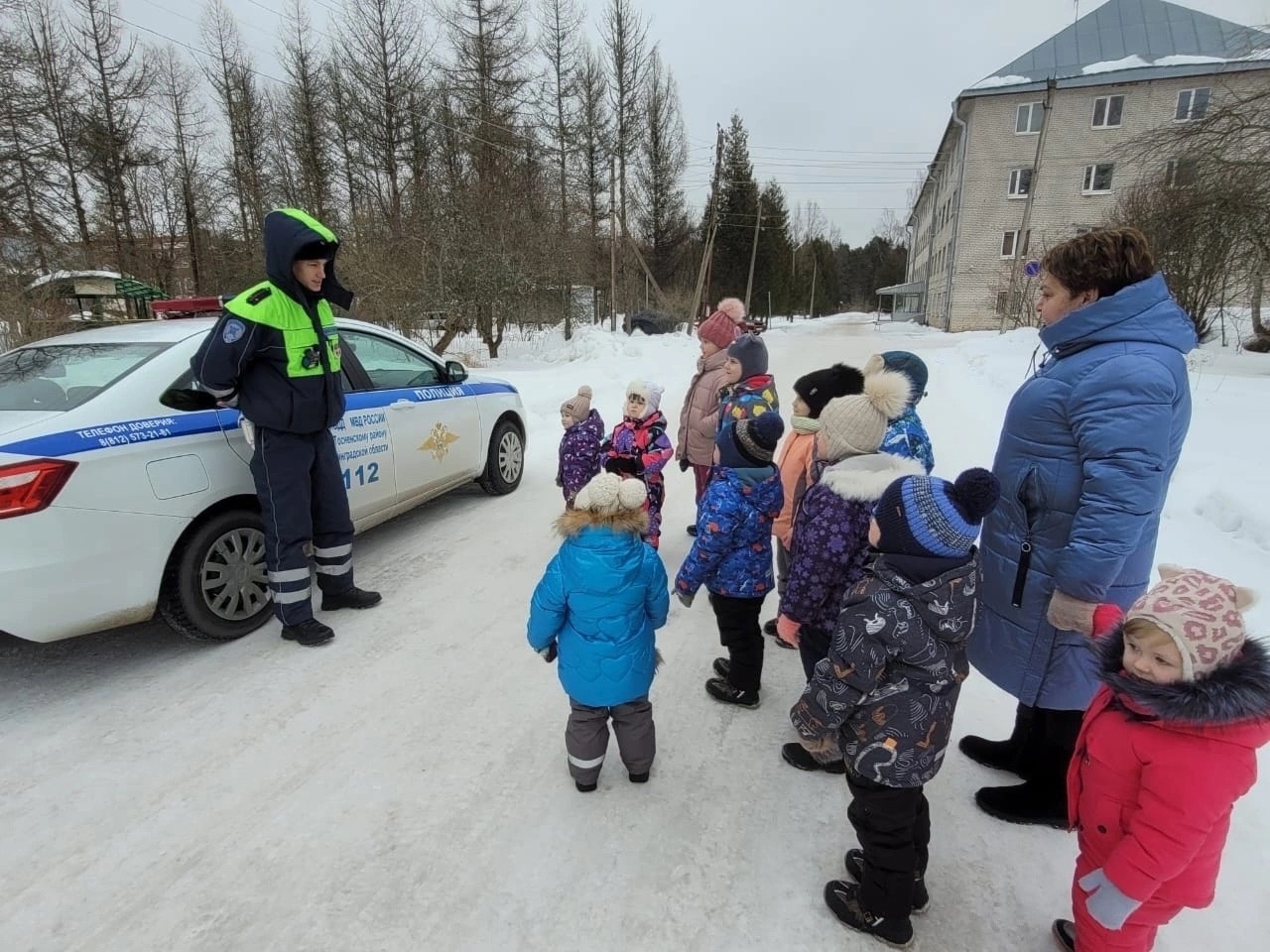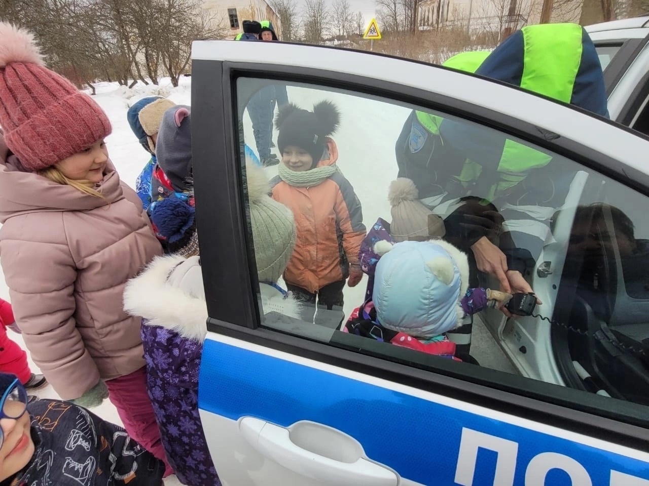 21 февраля к воспитанникам дошкольного отделения группы «Солнышко» приехал в гости, сотрудник ДПС Комарицын Ярослав Павлович, для проведения профилактического мероприятия по обеспечению детской безопасности на улицах и дорогах. Сотрудник ГИБДД продемонстрировал ребятам патрульный автомобиль, на котором ежедневно несут службу дорожные полицейские. Ярослав Павлович показал в действии специальные звуковые и световые устройства которыми оборудован служебный транспорт, а так же рассказал, что служебная машина оснащена светоотражающим жилетом, рацией для связи. Каждый желающий не только смог посидеть в автомобиле, но и нажать кнопку рации.